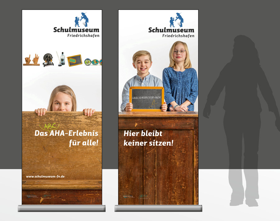 Ein echter Hingucker: die Rollups bestechen durch die lebensgroße Darstellung der Kinder. Die Atmosphäre des Schulmuseums ist aufgegriffen, die Zielgruppe angesprochen: Kinder, Eltern, Großeltern, Pädagogen.