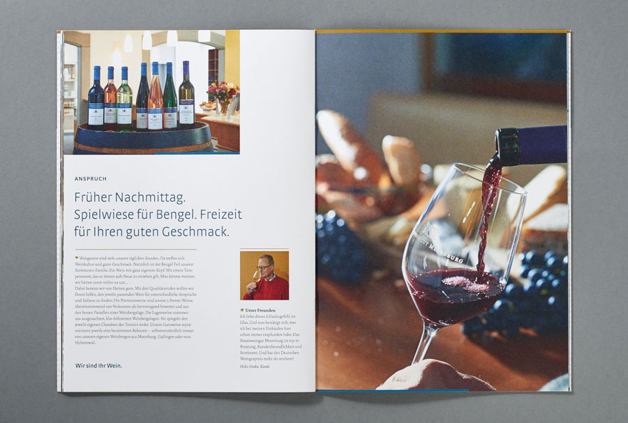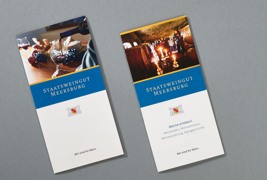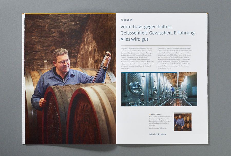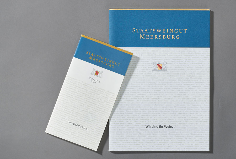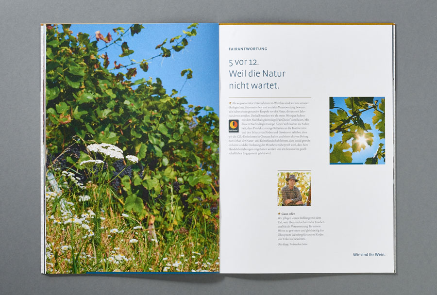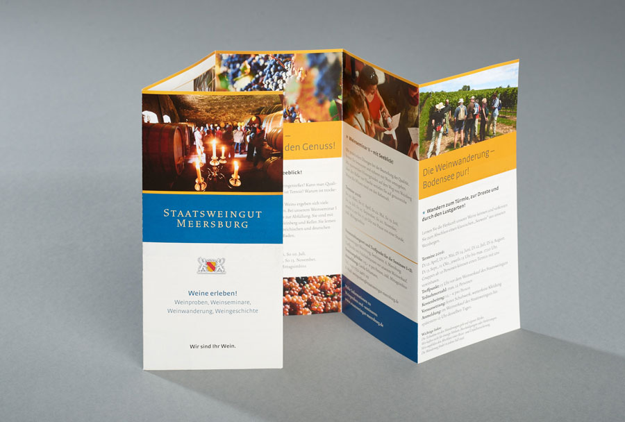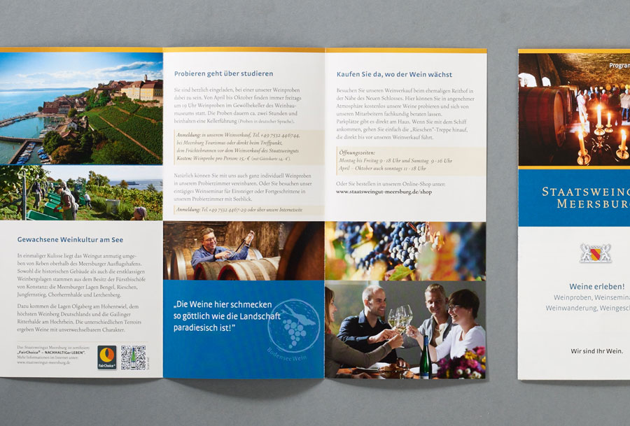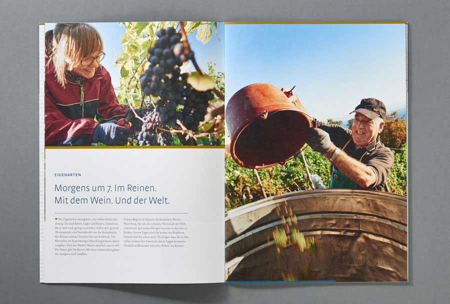 Die Imagebroschüre für das Staatsweingut Meersburg gibt es zwei Formaten: DIN A4 und DIN A5. In Groß und Edel für Weinhändler und Großhandel – in Klein als Streuartikel für Endkunden. Eine schöne Geschichte verbirgt sich hinter der edlen Frontseite mit Heißfolienprägung: im Tagebuchstil wird erzählt, von morgens um sieben bis abends. Der Reportagenstil animiert zum Lesen und Schauen. Menschen, die für die Weinproduktion und Vermarktung stehen und Menschen, die die Weinkultur leben, werden authentisch dargestellt.