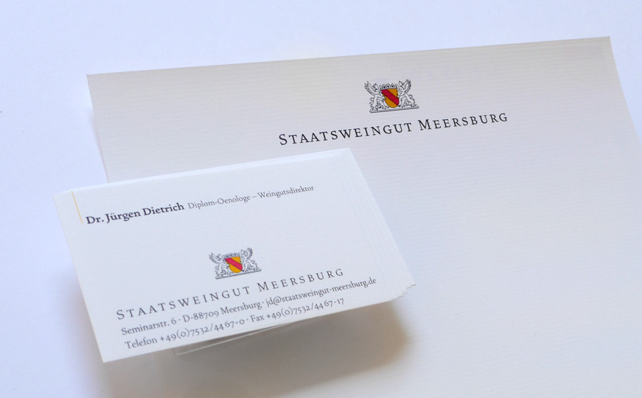 Die Geschäftsausstattung – ganz edel – auf Feinstpapier und mit Heißfolienprägung im Wappen. Mit gutem Grund: seit über 800 Jahren gibt es das Weingut in Meersburg.