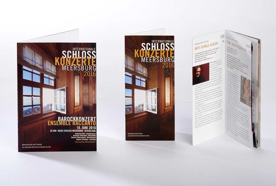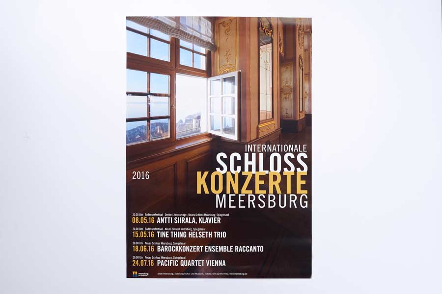 Die Internationalen Schlosskonzerte haben 2016 ein neues Erscheinungsbild erhalten. Der barocke Konzertraum – der Spiegelsaal des neuen Schlosses in Meersburg (fotografisch inszeniert von kuhnle + knödler fotodesign) macht Laune auf einen Konzertbesuch in einer lauen Sommernacht oder einem Winterabend. Die klare Typografie lehnt sich an das Corporate Design der Kulturreihen der Stadt Meersburg an.