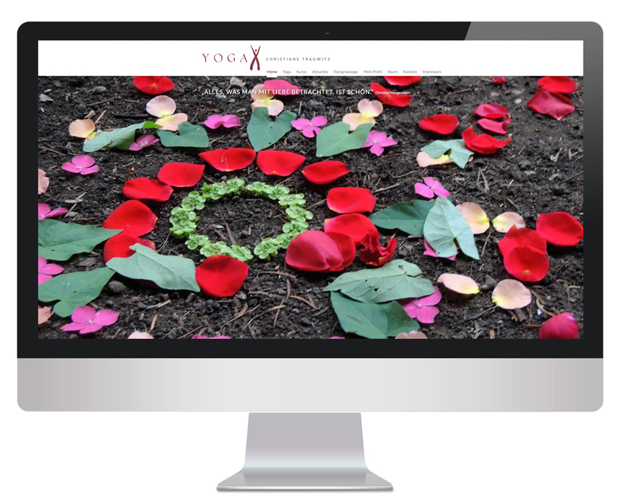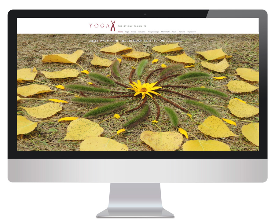 Kleine Slideshow als Intro, die gelegten Manadala-Bilder aus Blüten lassen die Yogawelt sympathisch aufblühen. Die Reduziertheit war Kundenwunsch und macht die Seite schlicht, einfach und ergreifend. Ganz wie im Yoga...